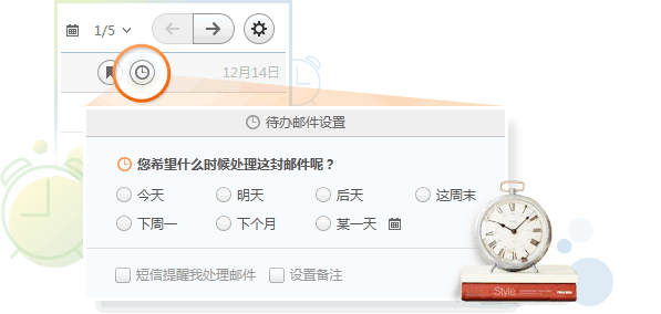 对于需要后续处理的重要邮件,如果正忙来不及处理和回复,只需设置为待办邮件,在待办时间到期时,邮件会在文件夹置顶提示或采用短信方式提醒。